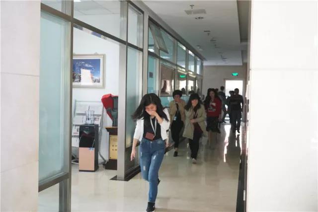 在疏散演習(xí)過程中,員工們按照疏散線路有秩序撤離,并用濕毛巾(濕手帕)捂住口鼻,彎腰前行。