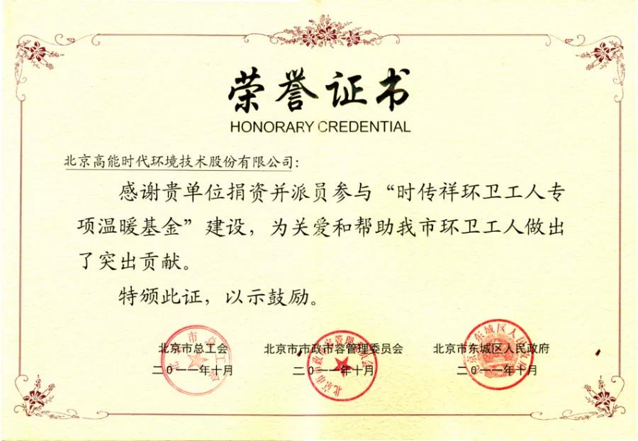 高能環(huán)境作為環(huán)保企業(yè),關(guān)注環(huán)保行業(yè)中每一個群體,作為環(huán)保工作第一線的環(huán)衛(wèi)工人,也是高能環(huán)境最為關(guān)心的環(huán)保人。早在2010年,高能環(huán)境就聯(lián)合北京市總工會、北京市市政市容管理委員會、北京市東城區(qū)政府等單位發(fā)起“時傳祥環(huán)衛(wèi)工人專項溫暖基金",并捐資100萬用于幫助北京市家庭困難的環(huán)衛(wèi)工人。