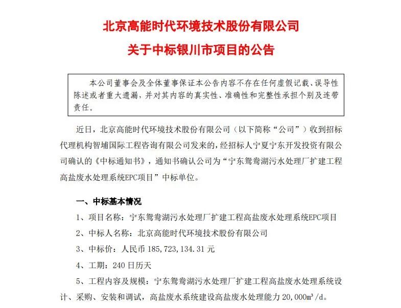 高能環(huán)境(603588)12月26日發(fā)布公告稱,公司收到由寧夏寧東開發(fā)投資有限公司發(fā)來的《中標(biāo)通知書》,確認(rèn)中標(biāo)“寧東鴛鴦湖污水處理廠擴(kuò)建工程高鹽廢水處理系統(tǒng)EPC項(xiàng)目”,中標(biāo)金額約1.86億元,項(xiàng)目包含寧東鴛鴦湖污水處理廠擴(kuò)建工程高鹽廢水處理系統(tǒng)設(shè)計(jì)、采購(gòu)、安裝和調(diào)試,高鹽廢水系統(tǒng)處理規(guī)模20,000 m³/d,項(xiàng)目工期240日歷天。